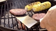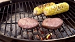 Gegrillte Rindfleisch-Hamburger auf einem altmodischen Holzkohlegrill mit verkohltem Mais auf dem Kolben