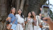 Medium shot of hand taking photo of smiling girlfriends standing together in front of the famous El Árbol del Tule, the ancient cypress tree that is one of Oaxaca's most iconic natural landmarks