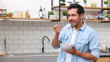 Hübscher Mann, der zu Hause eine Schüssel Obst und Müsli zum Frühstück genießt - 4K Stock-Video
