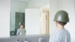 4k video footage of a young boy saluting himself in the bathroom mirror while wearing a military helmet