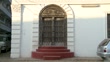 A close-up of a magnificent, traditional Zanzibar wooden door, set into a white stone building in Stone Town. The door features intricate carvings and prominent brass spikes, framed by a recessed archway and a white facade with decorative plasterwork. Red-painted steps lead up to the entrance. This video captures a quintessential element of the island's unique blend of Swahili and Omani architectural heritage.