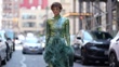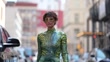 NEW YORK, NEW YORK - SEPTEMBER 13: (SLOW-MO) Irina Kro wears short tousled brown hair, yellow-tinted slim wrap sunglasses, a dark green rectangular leather clutch, a fitted long-sleeve mock-neck top in green and blue sequin animal-print, matching fitted sequin trousers with ruched ankles, an oversized teal-green ostrich-feather overskirt draped from the waist, lime-green strappy sandals with stiletto heels, outside Lapointe, during New York Fashion Week, on September 13, 2025 in New York City. (Footage by Edward Berthelot/Getty Images)