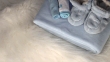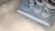 Blaue Hausschuhe, Decke und Waschlappen auf einer weißen, pelzigen Decke.