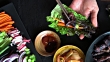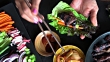 Assembling a healthy korean style lettuce wrap with Short Rib, Vegetables and fermented pickled kimchee using chopsticks.