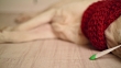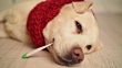süßer gelber Labrador liegt mit einem traurigen Blick auf dem Boden. an seinem Hals und ein roter Schal und ein Thermometer im Mund. Traurige Atmosphäre mit einem kranken Haustier. Die Kamera bewegt sich von links nach rechts. Dolly