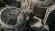AERIAL Large, cylindrical, hollow structures with metal grid, dome-like top, surrounded by buildings - 4K Stock-Video
