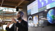 4K stock video clip of a Black man conducting a seminar / lecture with the aid of a large screen. The screen is displaying graphs & data associated with movie clips of the earth.