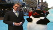 Leicester Square premier of 'Happy Feet'; Person in penguin costume dancing PULL OUT reporter to camera