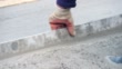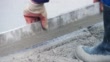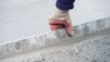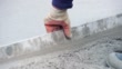 Medium handheld shot of the hands of a builder leveling the fresh concrete with a long leveling tool. Shot in Slovenia.