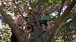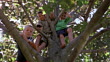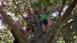 Low angle medium shot boys sitting in tree smiling down at CAM / New York - HD Stock-Video