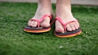 Nahaufnahme der männlichen Füße in Hausschuhen und der sich bewegenden Zehen.