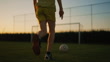 In the enchanting embrace of sunset, a captivating moment unfolds. The camera captures the rear view of a determined young boy in sportswear, sprinting across the grassy sports ground with a soccer ball. With precision and grace, he scores a goal against the backdrop of an orange-tinged sky. This scene embodies the magic of twilight, where his athletic prowess harmonizes with the vibrant sky, creating a breathtaking fusion of accomplishment and the serenity of nature's twilight charm.