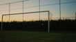 SLO MO männlicher Fußballspieler dribbelt auf dem Rasenfeld und schießt das Tor bei Sonnenuntergang - 4K Stock-Video