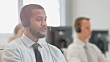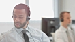 Medium dolly shot of a telephone operator in a technical support call center talking over the phone with a client guiding him through the procedure.