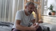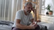 Man sitting on the bed and looking nervous. He is preparing to take pills