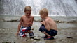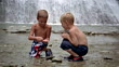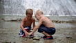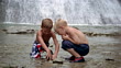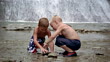 Medium shot boys looking under rocks in stream at foot of waterfalls / Stony Brook State Park, New York - HD Stock-Video