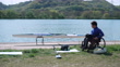 Medium shot of a paraplegic athlete preparing for paracanoe training beside a river in Japan