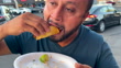 Mexican man eating a street tacos al pastor at a food truck