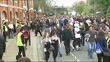 Michael Jackson statue at Fulham FC; Crowd outside Craven Cottage before Premier League match between Fulham and Blackpool