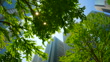 Modern office building visible through the fresh green trees