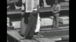 Montage workers at archaeological dig in Egypt carry pallet containing relics from the tomb of King Tutankhamun; armed guards follow / workers wade through water as they carry heavy crate to barge / barge moves in Nile River / workers remove crate from barge / montage workers carry crates, with armed guards escorting them / from Greatest Headlines of the Century