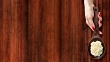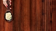 Draufsicht der Frau, die einen Holzlöffel voller Kartoffelpüree über den Holzhintergrund schiebt. Für die Positionierung des Löffels stehen drei Optionen zur Verfügung: links, in der Mitte und rechts