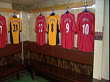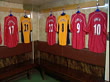 Pan right around Liverpool football players' shirts hanging in Anfield dressing room, Liverpool