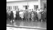 Pan showing refugees from East Berlin queuing outside a relief centre kitchen in West Berlin; 1959. (LCA6667P - AEVZ001J)