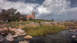 Panning reflection of a lighthouse on a rocky shoreline - HD Stock-Video