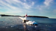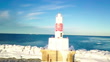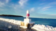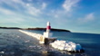 Panning shot of Petoskey pierhead lighthouse at marina, drone flying over frozen lake on sunny day - Famous landmark in Marquette