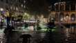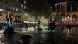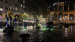 People stand in front of the Stravinsky Fountain on an October evening in 2025, in autumn in Paris, France.