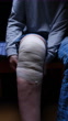 Die Person wickelt ihr schmerzendes Knie mit einem elastischen Verband ein