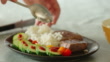 Plating two sous vide cooked and browned rump steak on plate with sliced cucumber topped with chili sauce next to layer of small and colourful decorative tomatoes. Brownish plate on gray tablecloth.