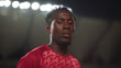 Slow motion low angle portrait of adult male international football player looking down at camera as it pans right with a determined and serious facial expression while standing in front of floodlights before big game