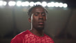 Portrait of adult male professional soccer player looking down at camera in illuminated sports stadium - 4K Stock-Video