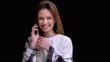 Porträt des jungen kaukasischen langhaarigen Mädchens in weißem T-Shirt, das auf Smartphone auf schwarzem Hintergrund schmunzelt. - 4K Stock-Video