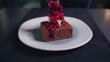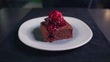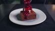 Den Brownie mit Vanilleeis mit Himbeermarmelade übergießen. - 4K Stock-Video