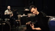 Practicing electric guitar in music studio. Slow Motion video of a man enjoying playing rock music in recording studio