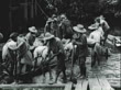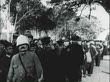 Some shots are reenactments, others are genuine. (Reenactment) TLS escaping convicts running along beach on Devil's Island, sprinting toward camera. (Reenactment) MSTLSs convicts scampering about large dank prison cell, either getting out of beds or leaping into them. Rear view LS escaping convicts running into surf, wading for waiting sailboat. Great panning MS prison guard and inmate entering prison cell afterhours for bed check, inmate holding lantern. VO mentions rash of recent mass escapes from Devil's island. (Reenactment) TLSMS French man apparently an Island escapee meeting mother on otherwise empty street; they embrace, music swells. Excellent panning LS French soldiers carrying rifles with affixed bayonets, marching inmates who carry their meager belongings in sacks to docks. High angle TLSs white male convicts (look at all the fedora hats) shuffling along brick dock, boarding boat. MS crowd on boat (note the black French soldier in FG).