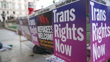 Protesters listening to speeches with rainbow flags and placards 'Stand Against Suella' / placards 'Trans Rights Now', 'Refugees Welcome' / Daniel Lismore (Designer) in drag / placards 'Fight for a LGBT Plus liberation', 'LGBT and Women Refugees Welcome Here'