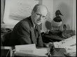 MOT 1935: DARLING SPEAKS: Pulitzer Prize winning cartoonist J.N. 'Ding' Darling sitting at desk saying ducks have had hard year football comparison (Frog Hollow to Notre Dame) cartooning while speaking hunters complain reward will be in future.