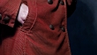Menschliche Hand legt Kartenetui aus der Tasche der rostigen Cordjacke