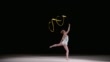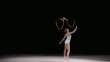 Slow motion wide speed ramp locked down shot of a female rhythmic gymnast doing a ribbon exercise while running across the floor. Shot in Slovenia.