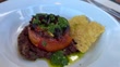 This clip features a roasted tomato entree at a restaurant in Tigre, Argentina. The dish was served in a white ceramic bowl. A corn chip, ground meat, and green-colored sauce are also visible.