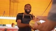 Verkäufer spricht mit Kunden, während er Bananen auf einem Straßenmarkt verkauft - 4K Stock-Video