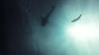 Filmed from a scuba diver's point of view, one large Whale Shark (Rhincodon typus) swimming above. Sun rays penetrate the water's surface creating its silhouette, while bubbles from the diver's breath rise towards the majestic creature. A bucket list encounter with the world's largest fish. 4k wide angle footage from Andaman sea, Thailand. No AI used.