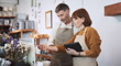 Senior white couple work together at own small business retail shop. Discuss talk using digital tablet, computer. Sell art and craft home decor product. Adult business people, SME entrepreneur concept