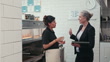 A push-in, medium shot of a mid-adult Indian woman and a mature caucasian woman in a fish and chips shop in Newcastle-Upon-Tyne. The mature woman is a financial advisor being shown around the business by the owner.Images are also available for this scenario.