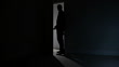 Silhouette des Mannes, der den dunklen Raum verlässt, mit Schatten, die vom Landelicht geworfen werden. Als er ging, schloss er die Tür.