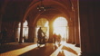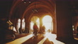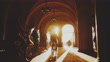 Slow motion shot of silhouette people riding bicycles in arch tunnel under Rijksmuseum at Amsterdam during sunny day